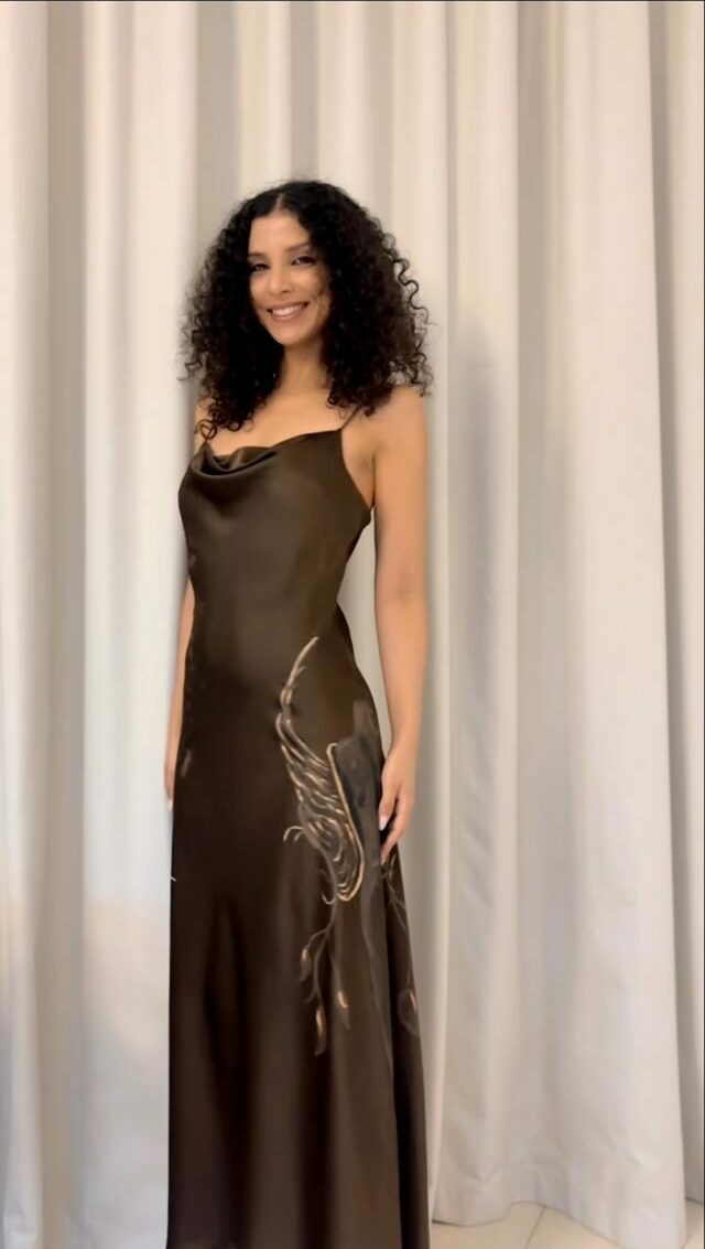 In rich dark brown silk, this dress embraces both elegance and strength,